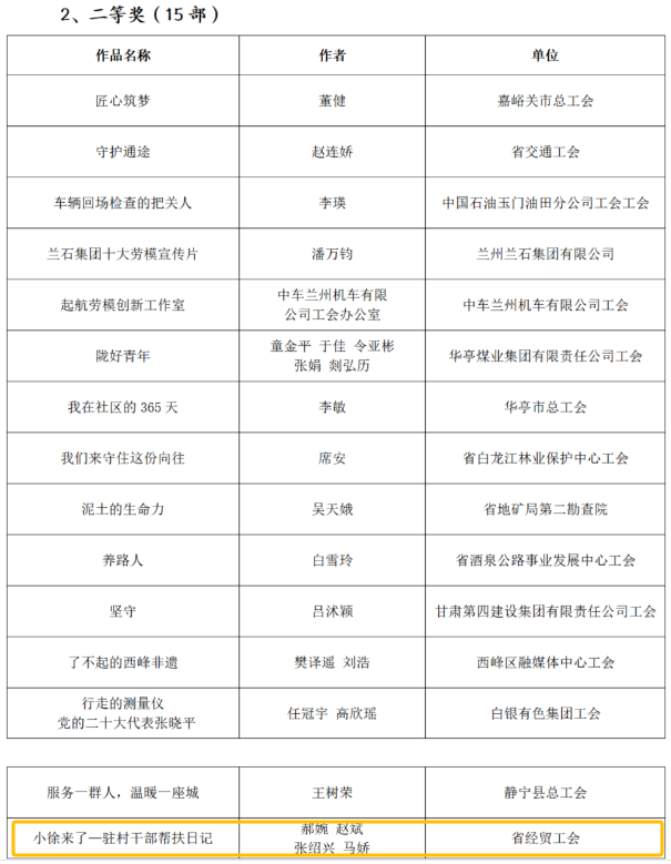近日,由甘肃省总工会和省委网信办联合举办的2024年“网聚职工正能量 争做甘肃好网民”主题活动获奖作品名单公布。甘肃物流集团综保区公司参赛作品《小徐来了——驻村干部帮扶日记》荣获微视频作品二等奖。