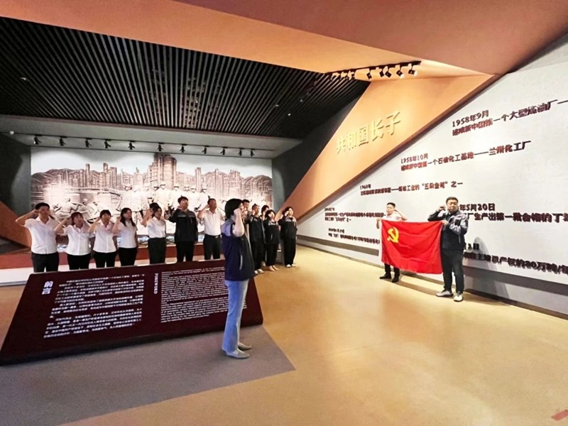 活动中,大家重温入党誓词,接受党性教育和政治信仰的洗礼,怀着敬仰先辈、先烈的心情参观展览,随着讲解员的讲解,大家在一份份文献资料、一张张历史照片、一件件设备面前驻足,学习老一辈工作者“苦干实干”、“三老四严”为核心的石油精神;“自强不息、艰苦奋斗,兴业报国,敢为人先、追求卓越”的兰州石化精神。深刻感受他们为了国家富强和人民幸福,抛头颅、洒热血的爱国情怀,聆听老一辈石化人肩扛手挑用自己一腔爱国热情建设新中国、顽强拼搏研发一系列世界领先石油化工产品为国争光的事迹……。